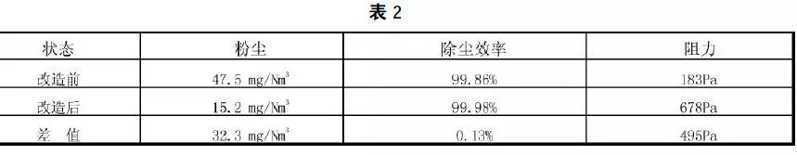(1)電袋復合式除塵器改造前后煙塵排放濃度及本體阻力對比(見表2)。